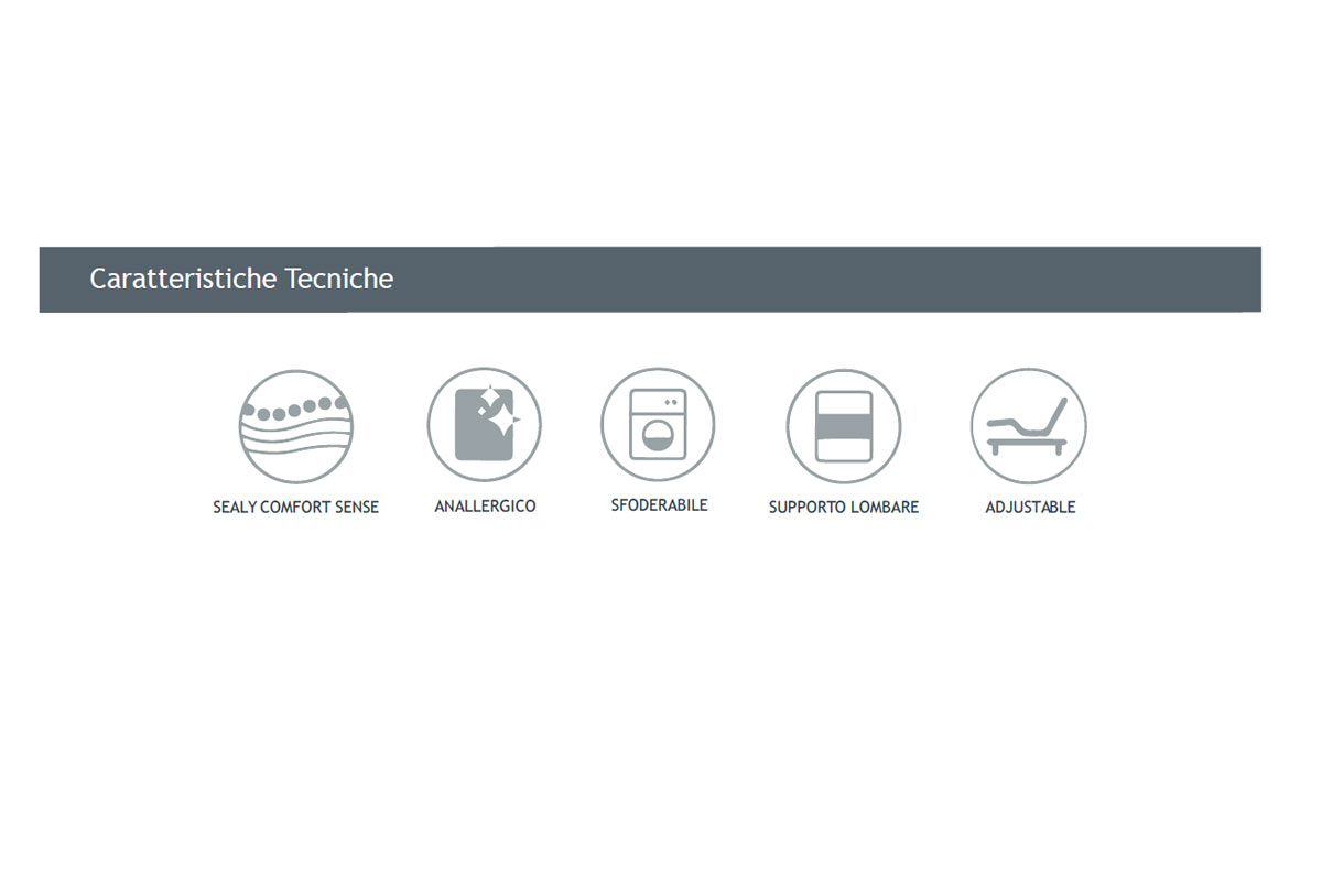 - Blocco a 3 strati h. 20 cm (Sealy Comfort SenseTM e Sealy Foam) con 7 zone di portanza differenziata