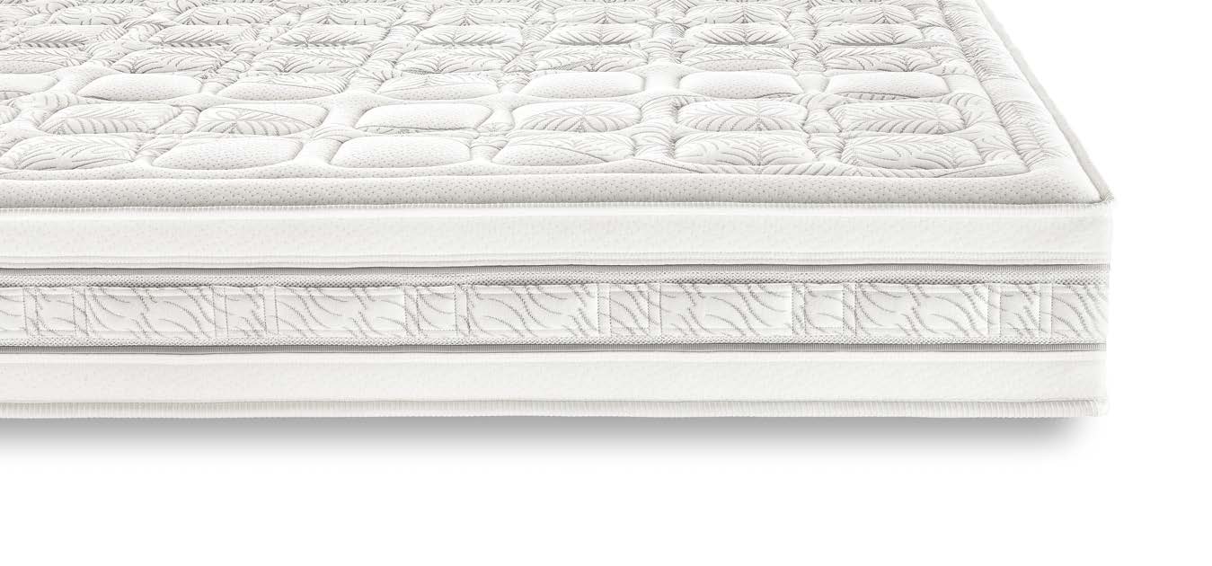 Materasso con struttura a sandwich a 3 strati e portanza multizona. Provvisto di una fascia con multimaniglia trapuntata in continuo e tessuto 3-space traspirante, ha un doppio semiguscio sfoderabile e lavabile. Il materasso, alto 24 cm. circa, è disponibile in 5 varianti di imbottitura.